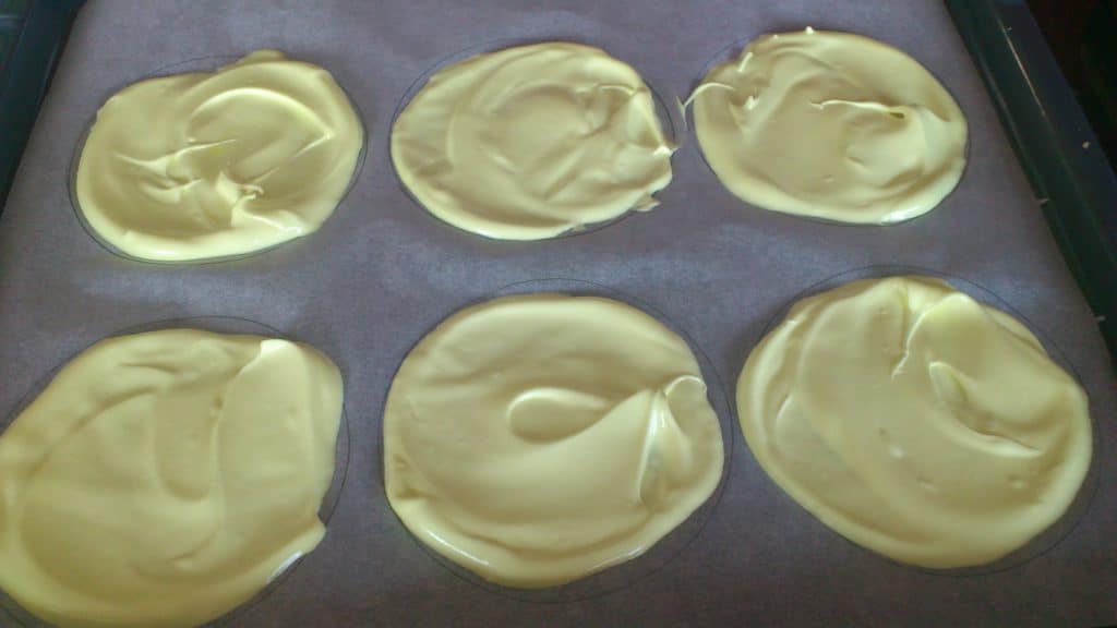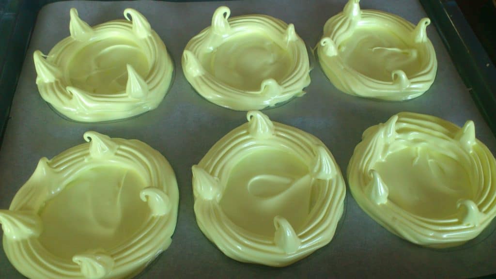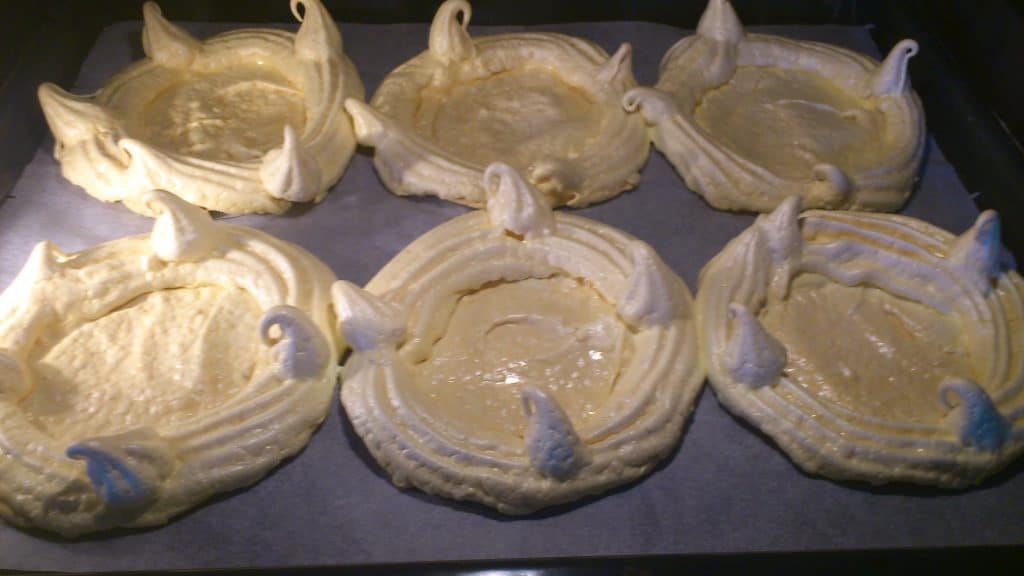 Till dagens dessert förberedde jag låga marängskålar nu på morgonen. Jag vispade 4 äggvitor till hårt skum, mot slutet av vispningen tillsatte jag ca 2 dl strösocker samt några droppar pressad citron. När marängen var färdigvispad (bunken gick att vända upp och ner ) droppade jag i lite gul karamellfärg så att marängsmeten fick en fin gul ton, påskhelgen till ära. På ett bakplåtspappret ritade jag 6 cirklar. Jag bredde ut lite av smeten innan jag spritsade en kant runt så att det blev en liten låg skål.
