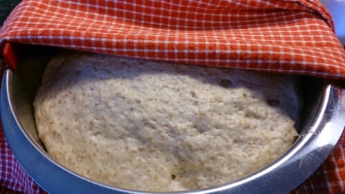 4. Arbeta degen i degmaskin cirka 5 minuter. Låt den jäsa övertäckt med bakduk i 30 minuter.