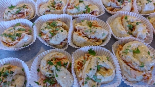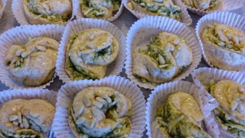 Att baka pesto- och pizzabullar är perfekt inför utflykter. Eller bara att ha hemma i frysen som mellanmål. Här kommer förslag på två olika fyllningar.