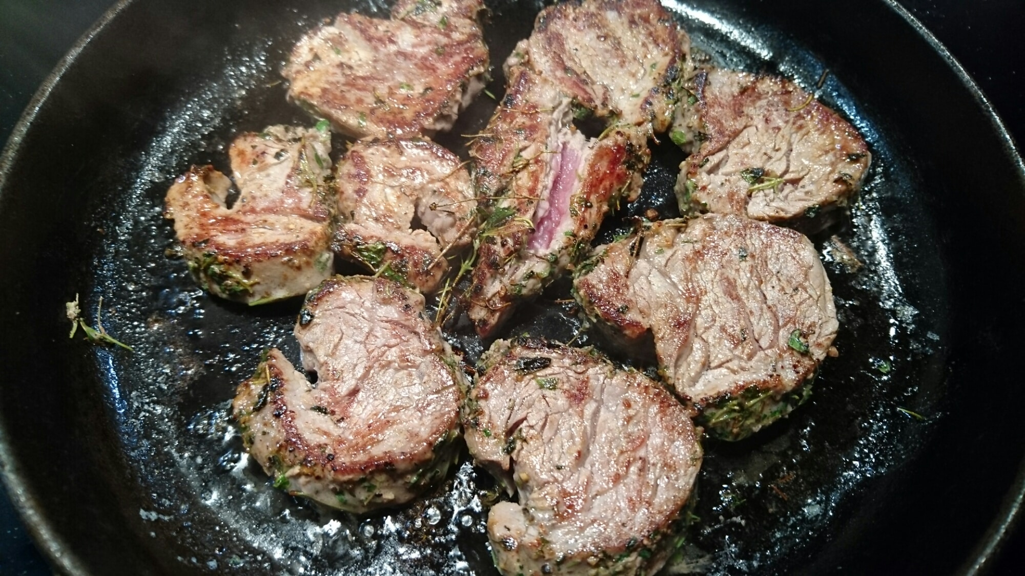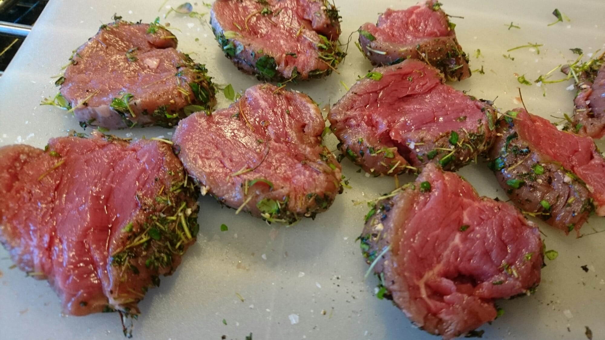Skär sedan filén i centimetertjocka skivor och platta ut dem lite. Krydda med salt och stek en kort stund på båda sidor.