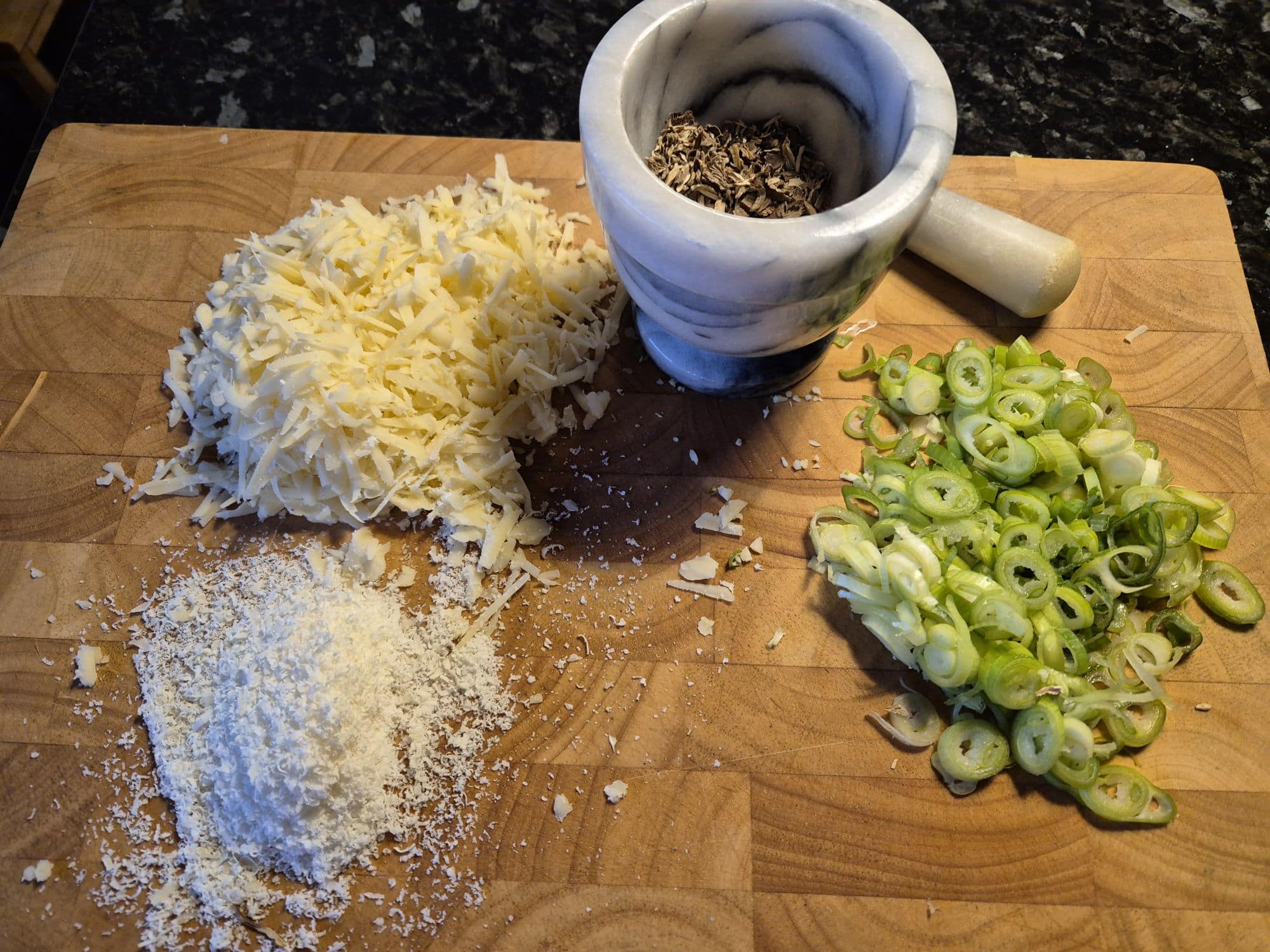 2. Riv prästost och parmesan. Skiva salladslöken tunt och mortla torkade trattkantareller.