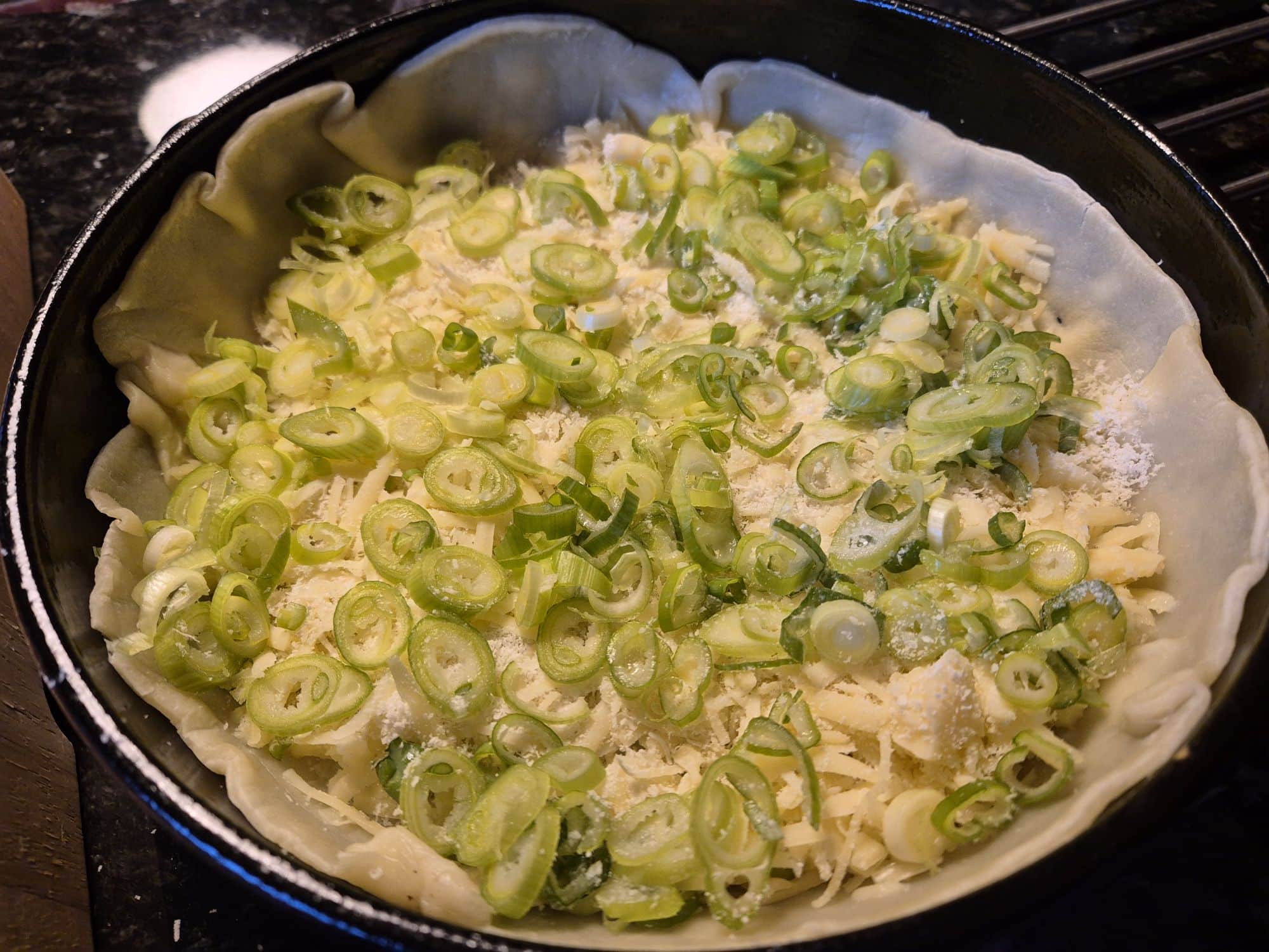 3. Lägg osten i botten på pajskalet med salladslöken ovanpå.