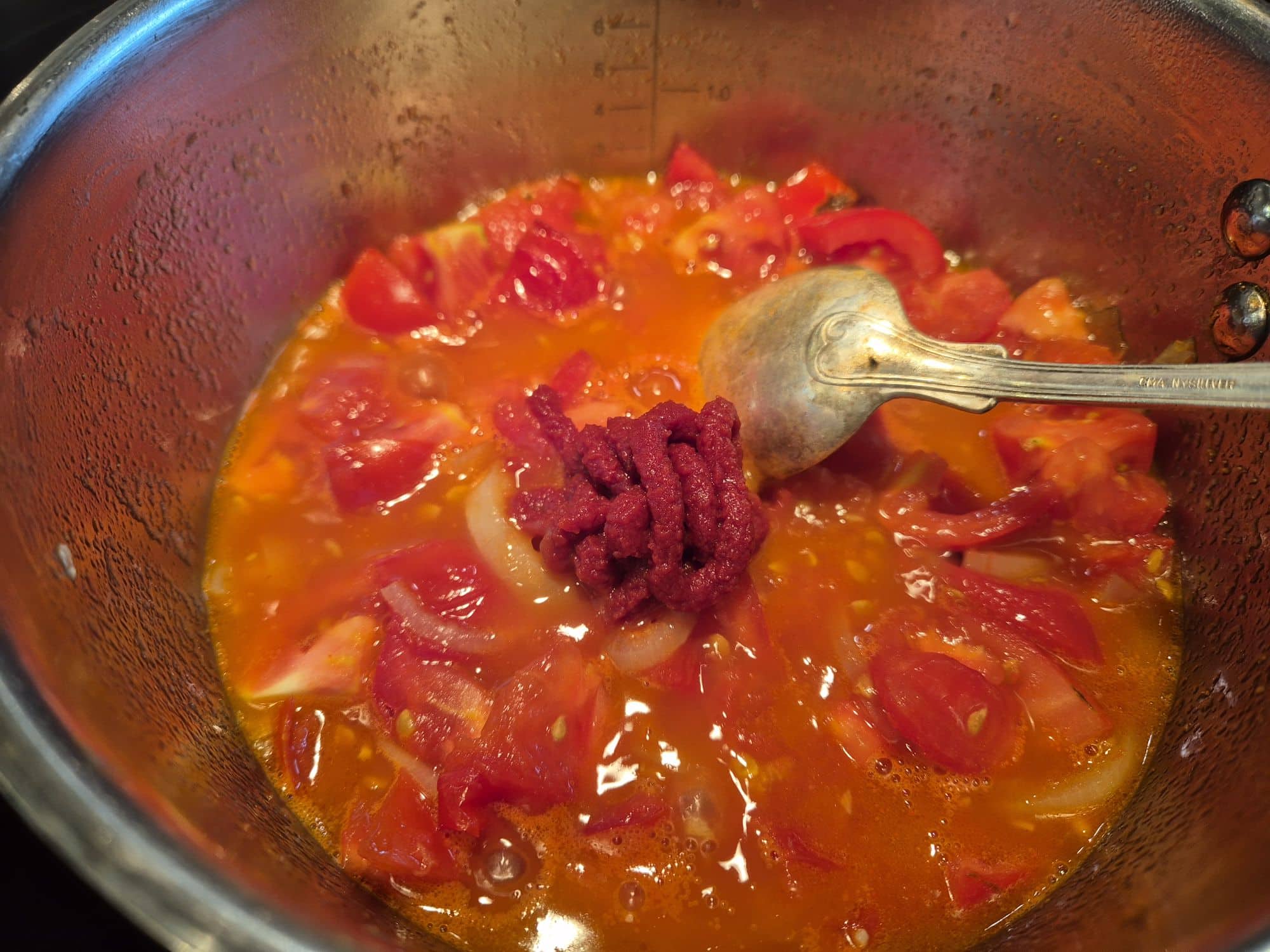 3. När tomaterna börjar bli lite mosiga tillsätts tomatpuré, salt och lite råsocker.