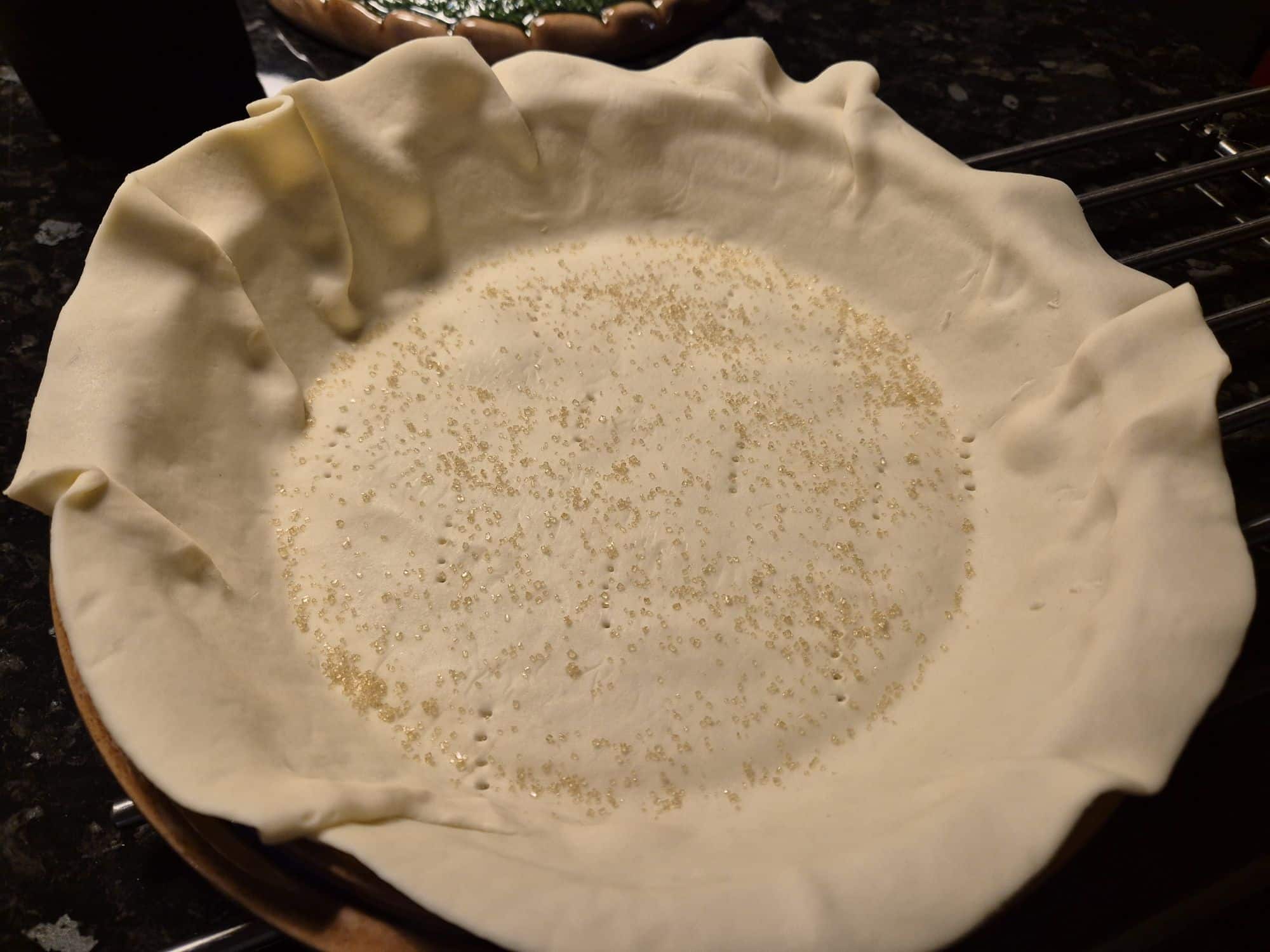 2. Gör pajdeg och förgrädda i 225° till dess att den får lite färg. Eller så gör du som jag, köp en färdig och använd. Jag strödde lite råsocker i botten som fick karamelliseras under förgräddningen för att ge en krispigare pajbotten.