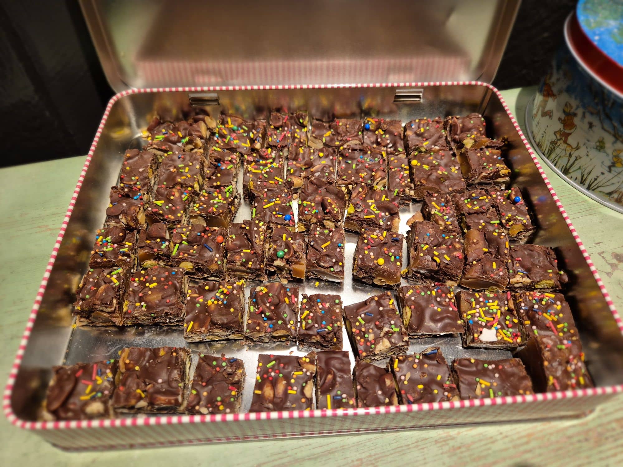 Rocky road : Det finns många recept här på sidan, sök på Rocky Road. Godisarna brukar bli lite olika varje år beroende på vad som finns hemma. Just i år använde jag inga marschmallows. Däremot smulade jag ner lite lantchips jag hade kvar i en påse i chokladsmeten. Gott blev det i alla fall.