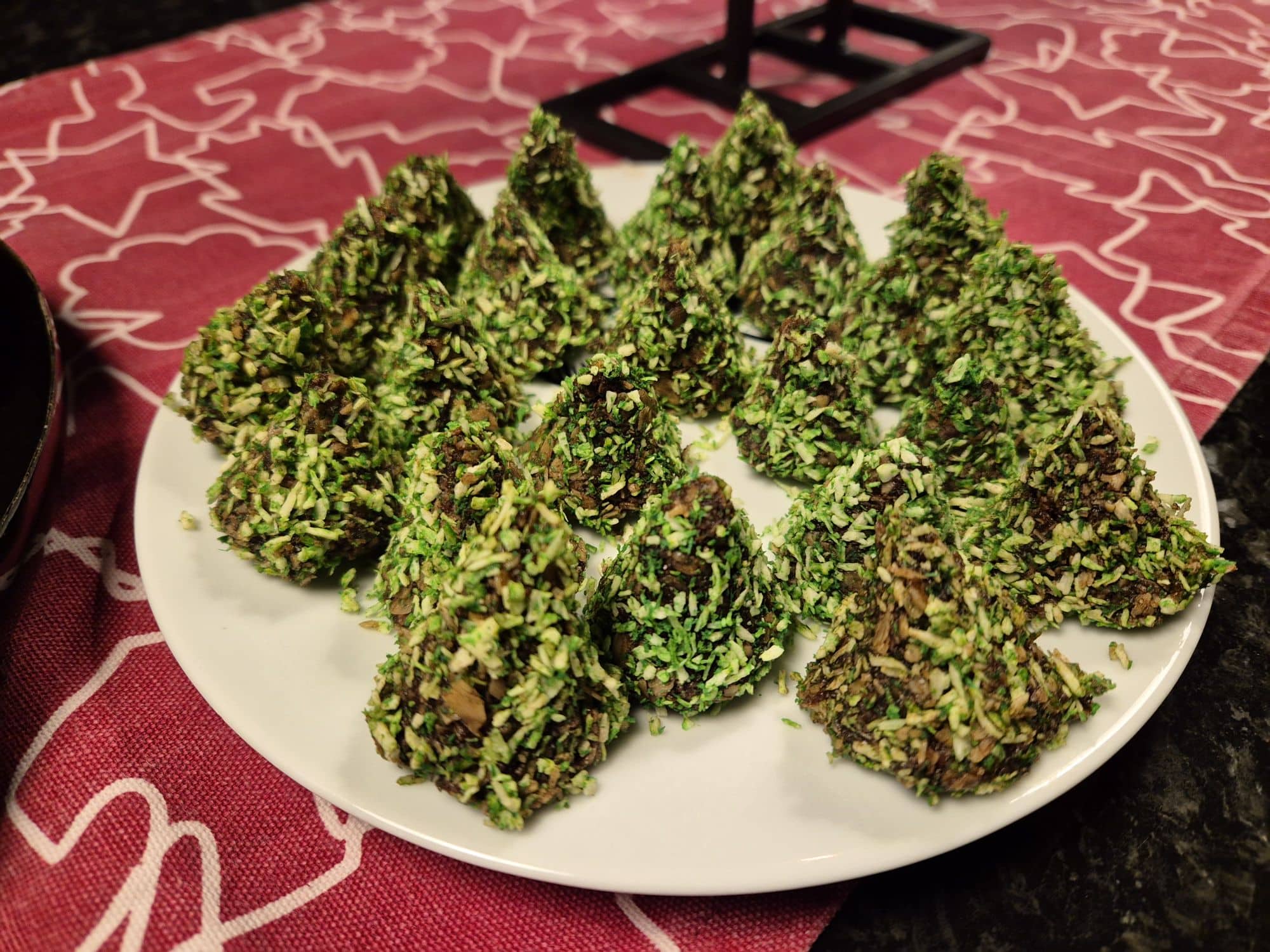 Chokladgranar Till chokladgranarna använde jag mitt recept på glöggbollar men bytte ut glöggen mot starkt kaffe. Sedan färgade jag kokos grönt att rulla granarna i (istället för pepparkaka).