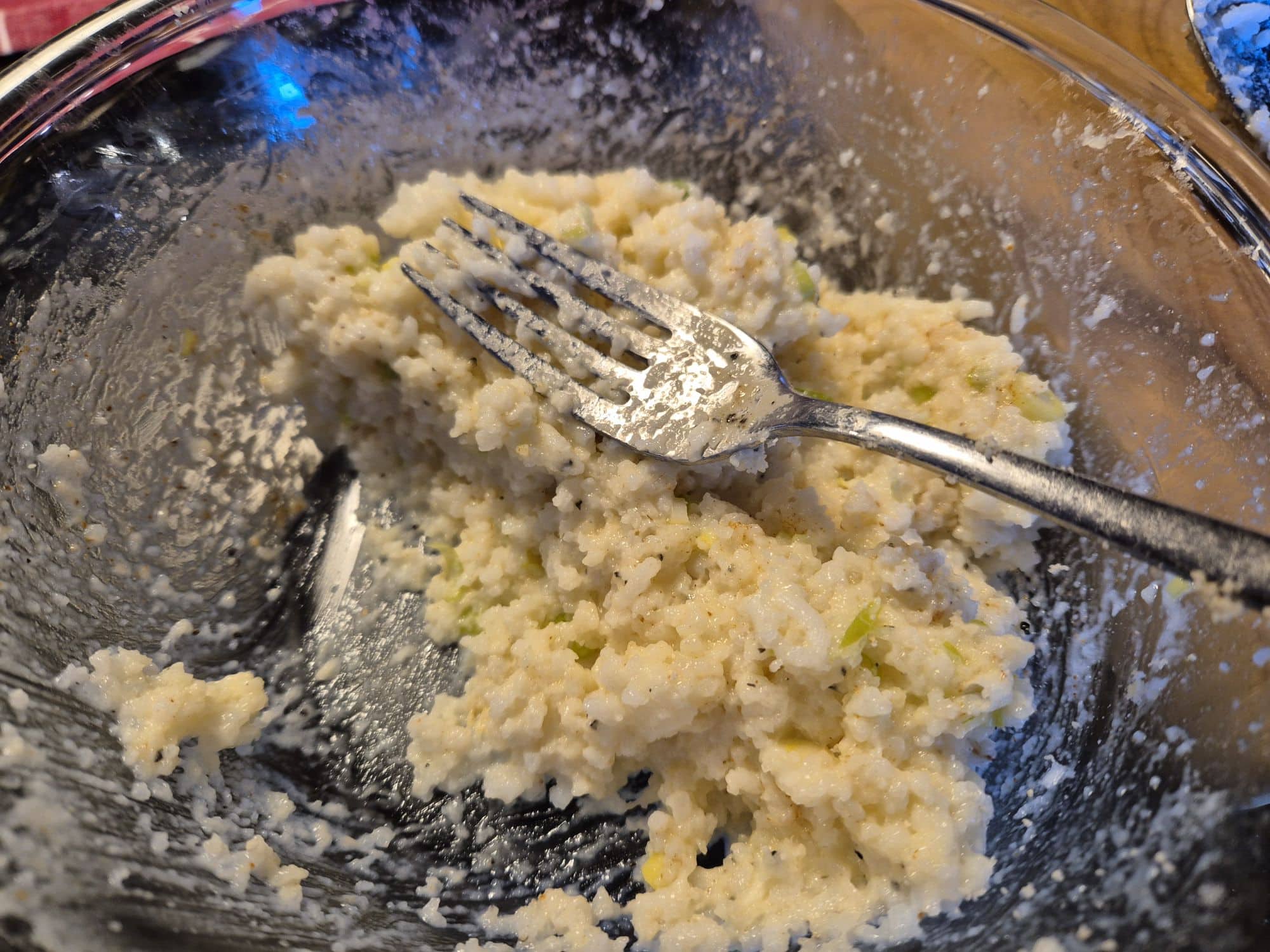 Jag använde mig av salladslök i biffarna men du kan riva ner morötter eller något annat du har hemma. För att biffarna ska hålla ihop bra är det en fördel om riset är klibbigt. Då blir de både lätta att forma och att steka.