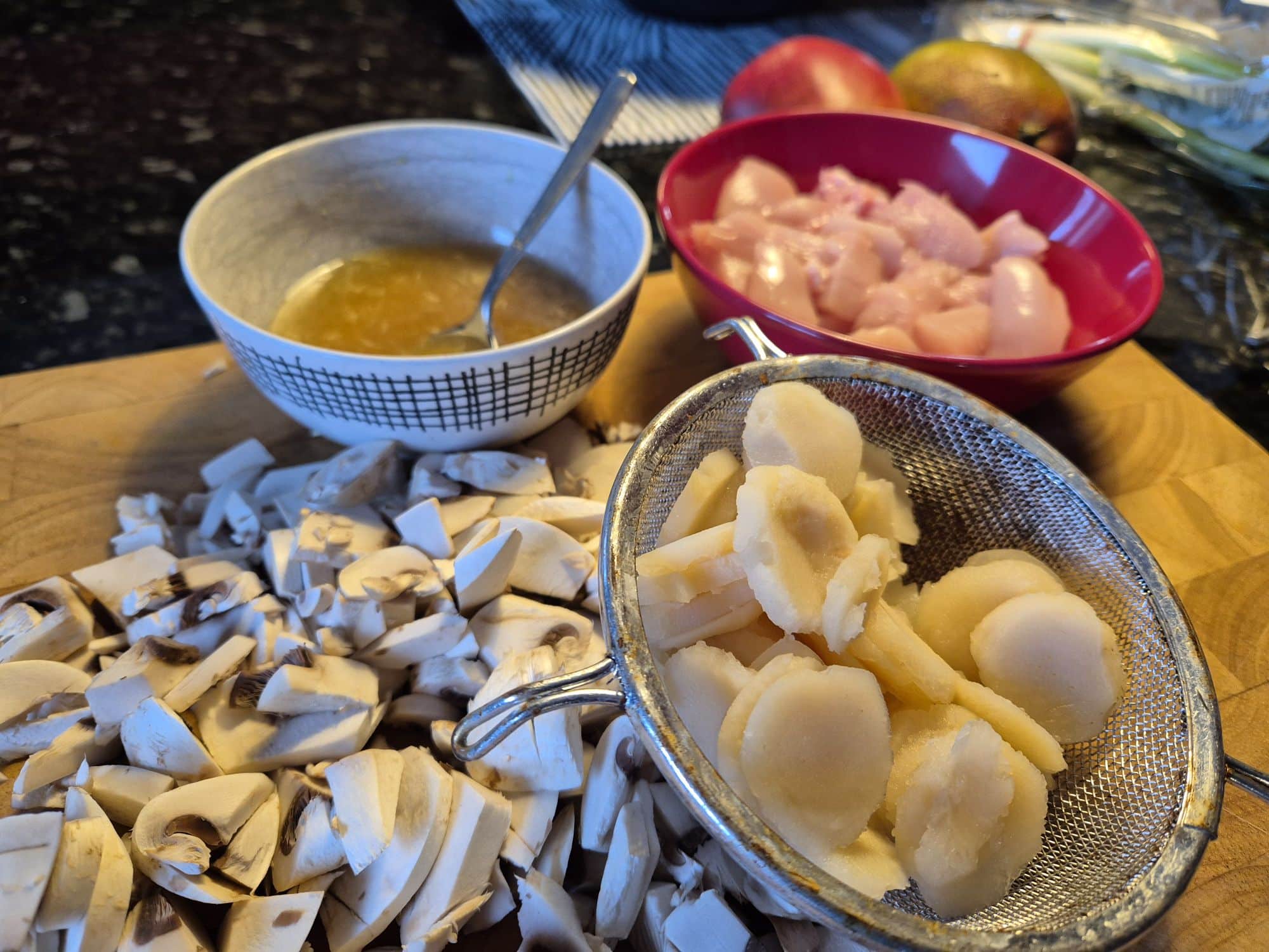 5. Dela under tiden kycklingen och svampen i mindre bitar.