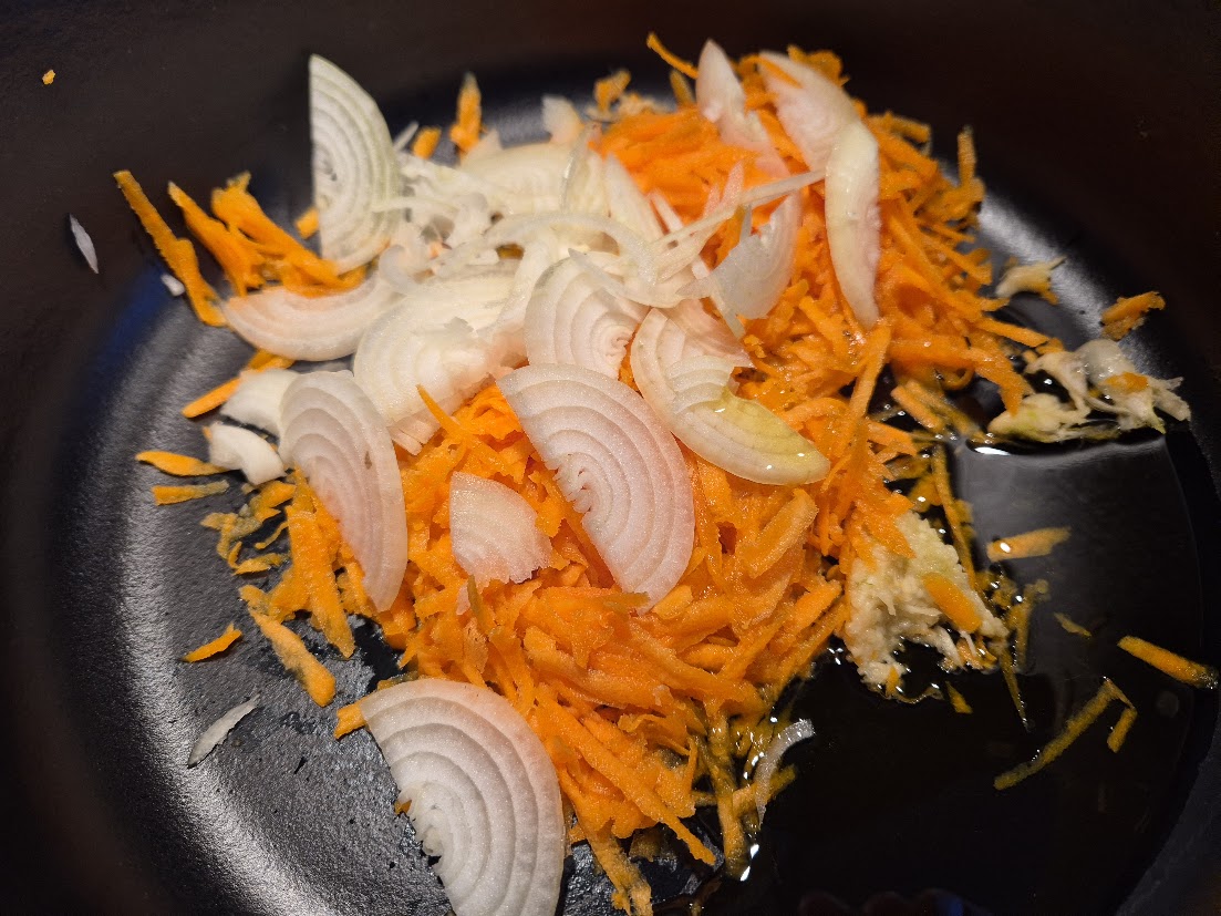 1. Riv moroten grovt, skiva den gula löken och finriv vitlöksklyftan. Stek mjukt i olivolja i en stekgryta.