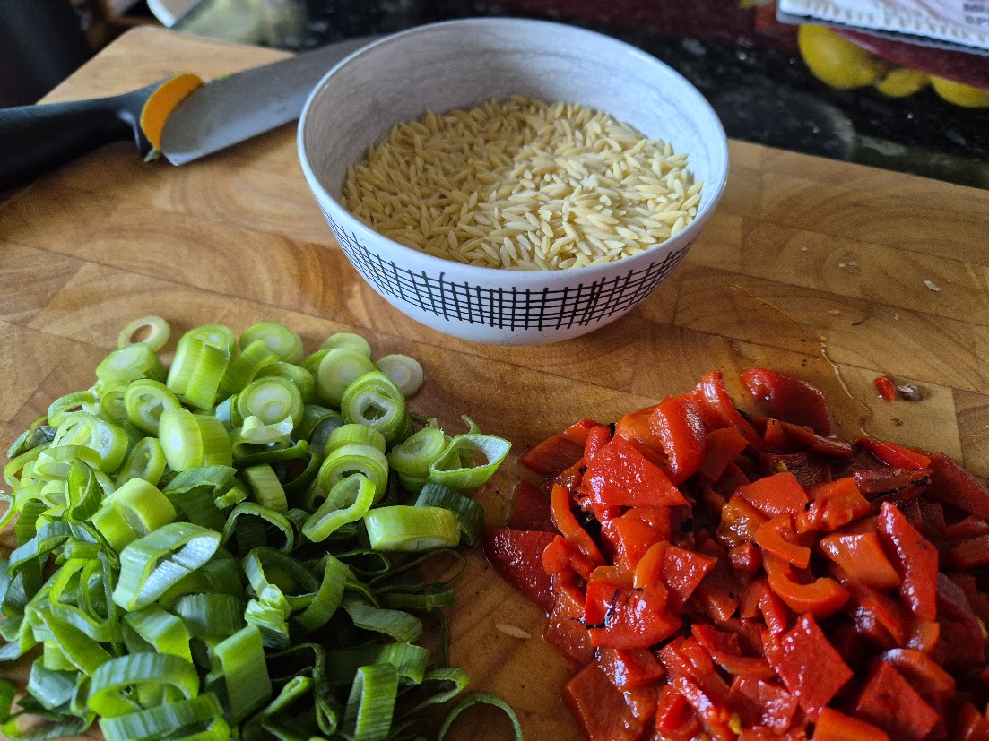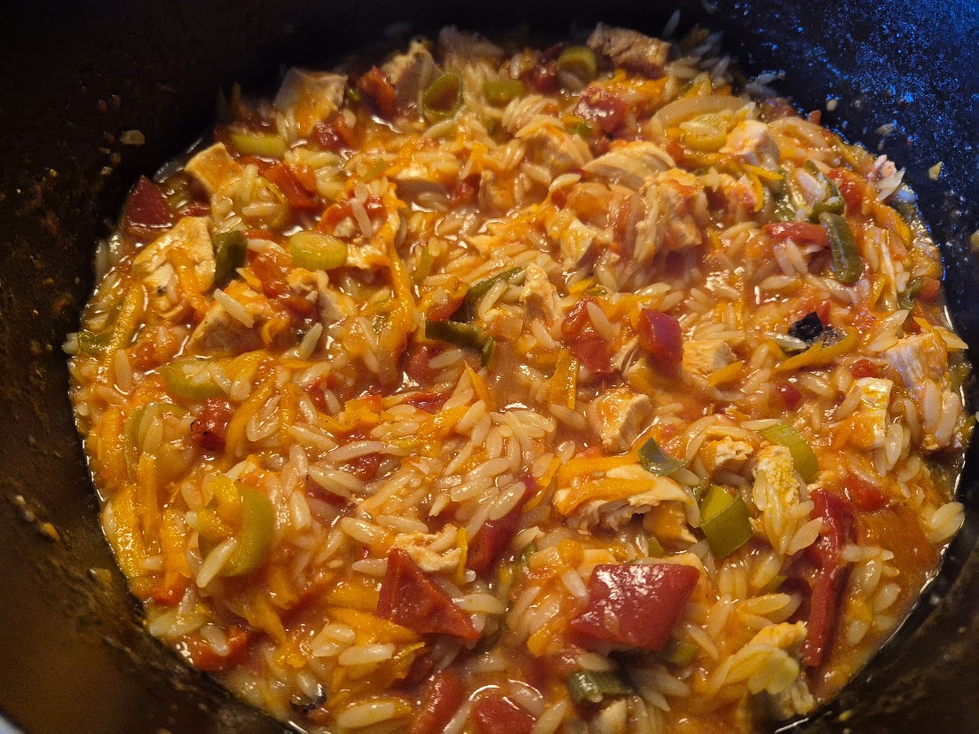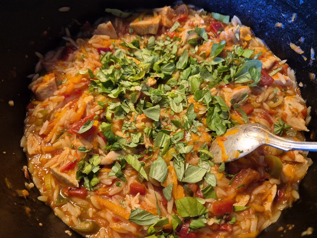 För ett tag sedan lagade jag till en fantastiskt god kycklinggryta med risoni. Den var magisk när den var nylagad men lika god att värma. Allt tillagades i samma gryta, först på spisen och sedan sattes den in i ugnen för att bli helt färdig.