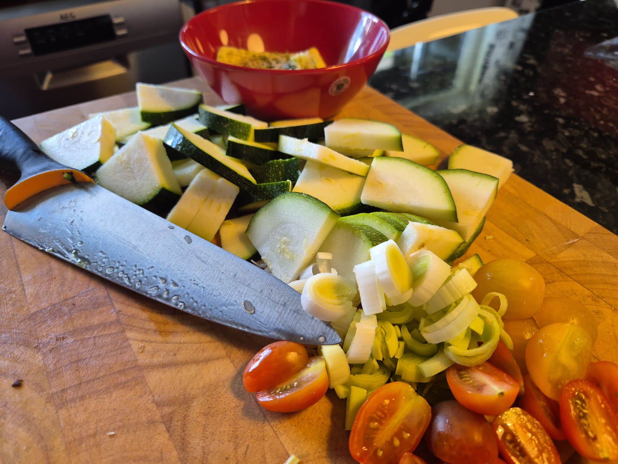 3. Dela squash i mindre bitar. Dela tomaterna och skiva purjolöken. När potatisen varit inne cirka 15 minuter tillsätts resterande grönsaker. Ringla över lite extra olja och krydda lätt med salt.