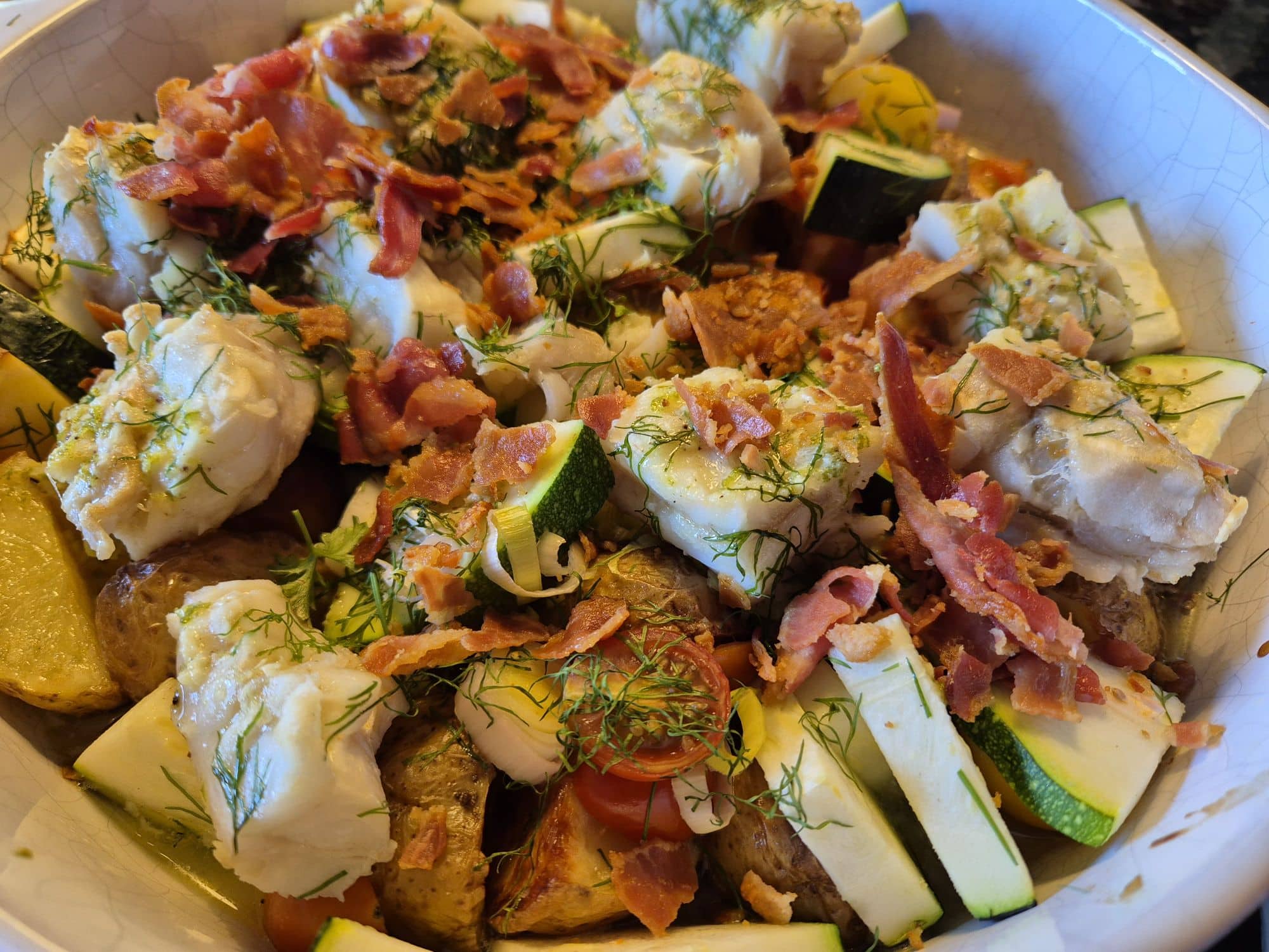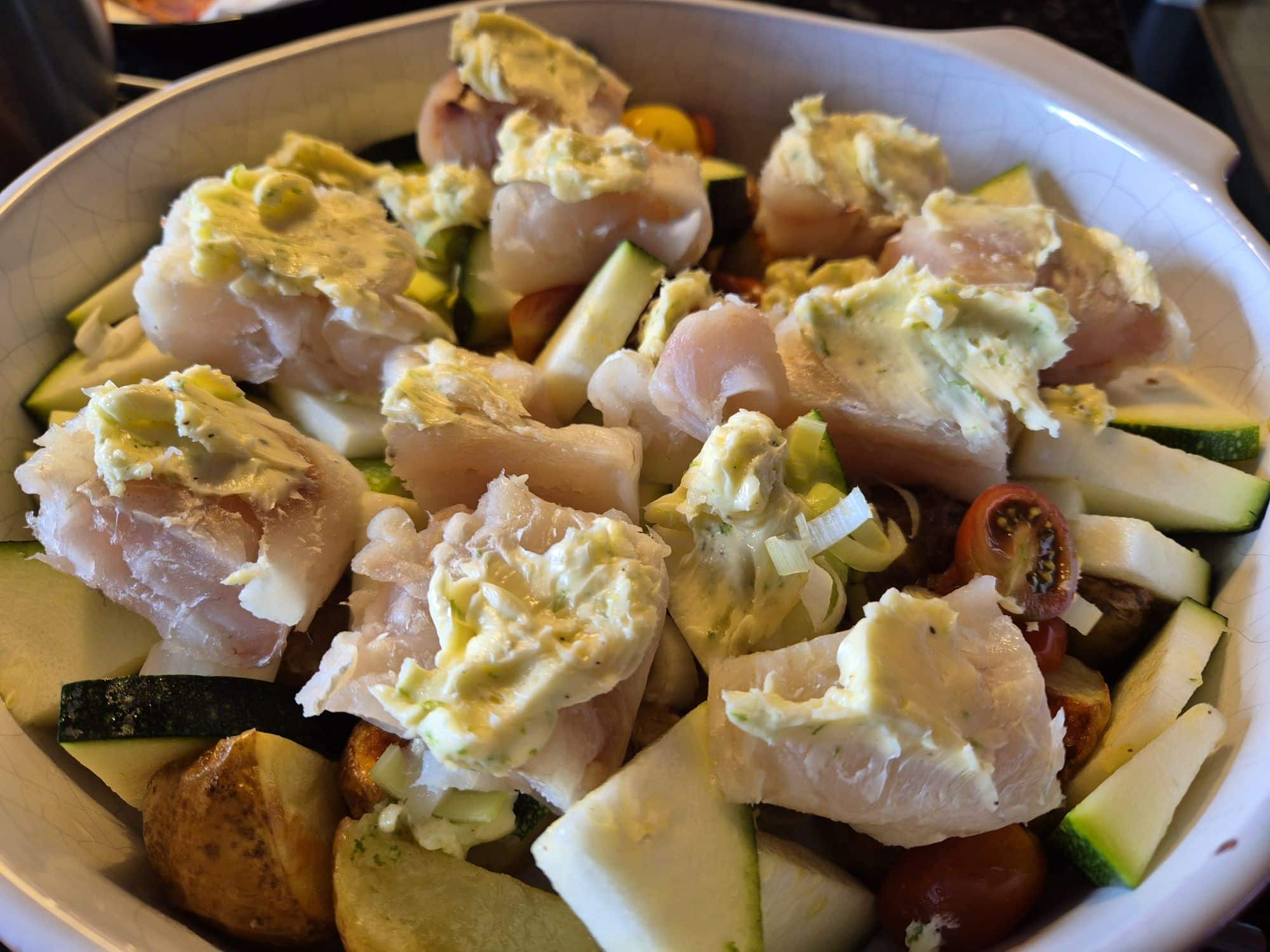Det här är en god rätt där allt lagas till i samma form. Ingredienserna får vara i ugnen olika länge bara. Börja med potatis, sen får squash, tomater och purjolök åka ner i formen och in i ugnen. När det nästan är klart lägger man torsken ovanpå i bitar med rejäla klickar limesmör ovanpå.