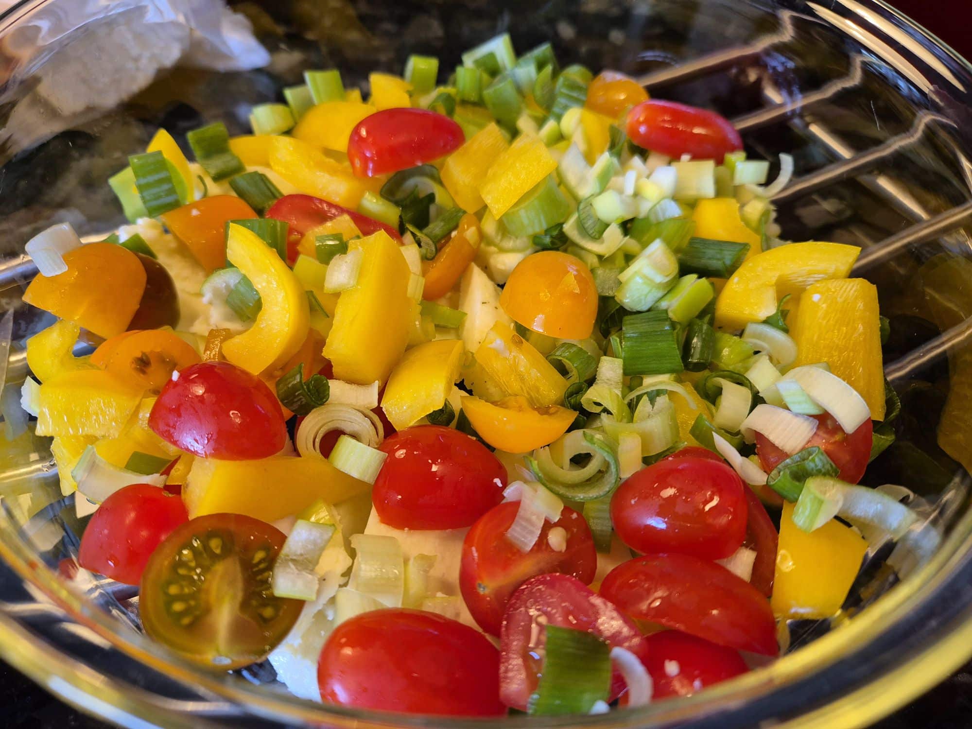 2. Dela tomater, skiva salladslök och hacka paprika. Lägg ovanpå grillosten.