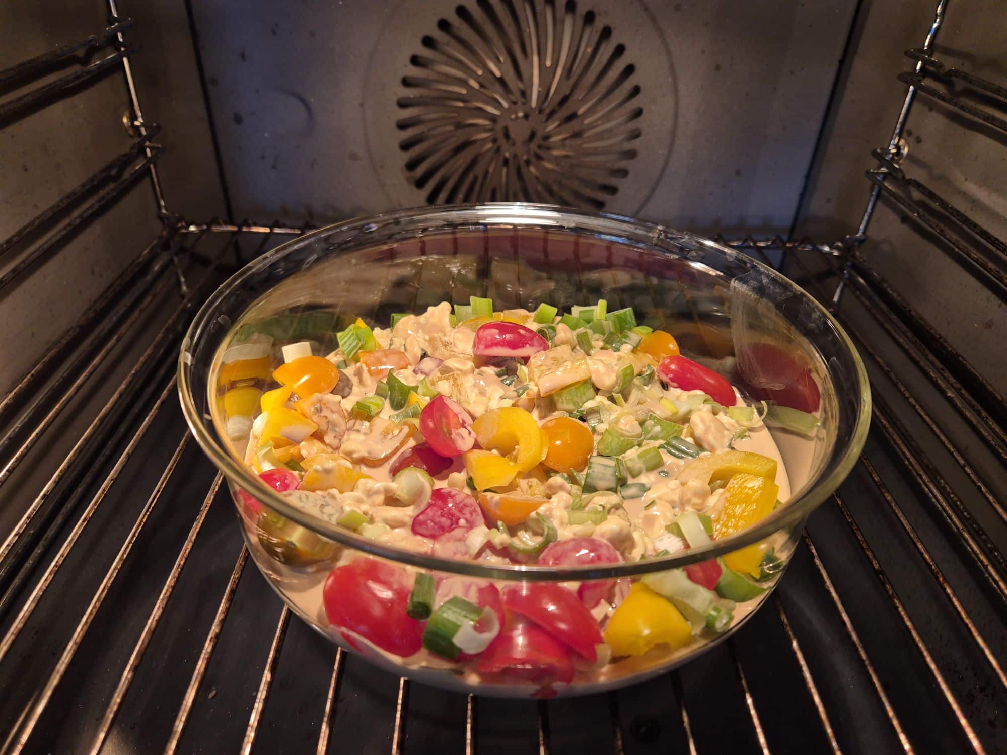 4. In i ugnen på 200° samtidigt som riset blir färdigt i riskokaren (eller kokar på plattan).