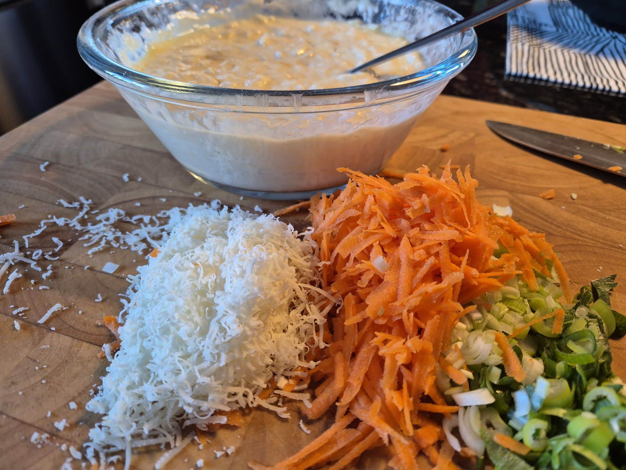 1. Riv moroten och parmesanosten. Hacka salladslöken.