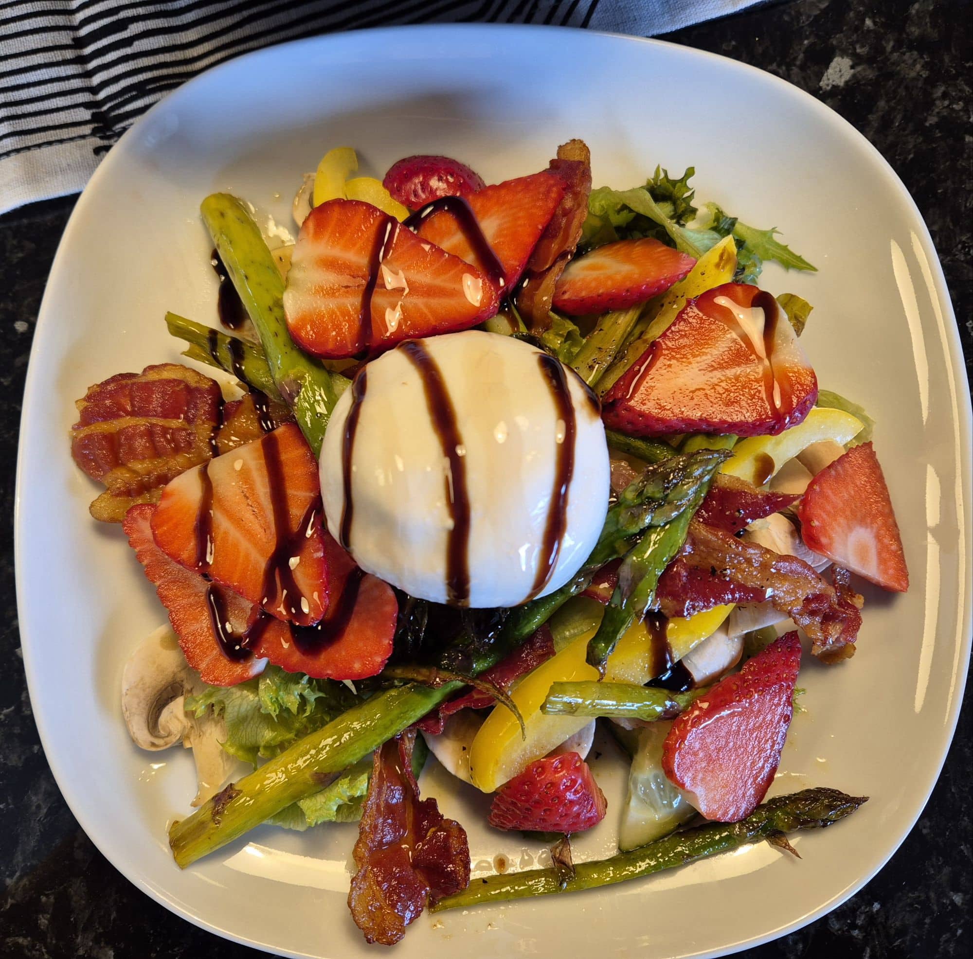 5. Lägg sparrisen och baconet på salladsbasen. Plus några skivade jordgubbar. Häll över smöret och honungen från stekpannan.